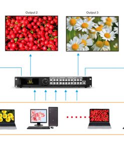 Nó cũng có thể điều khiển 4 màn hình khác nhau với nội dung độc lập. Bất kỳ đầu vào nào cũng có thể nhanh chóng được chuyển sang bất kỳ đầu ra nào mà không bị tắt tín hiệu hoặc màu đen.