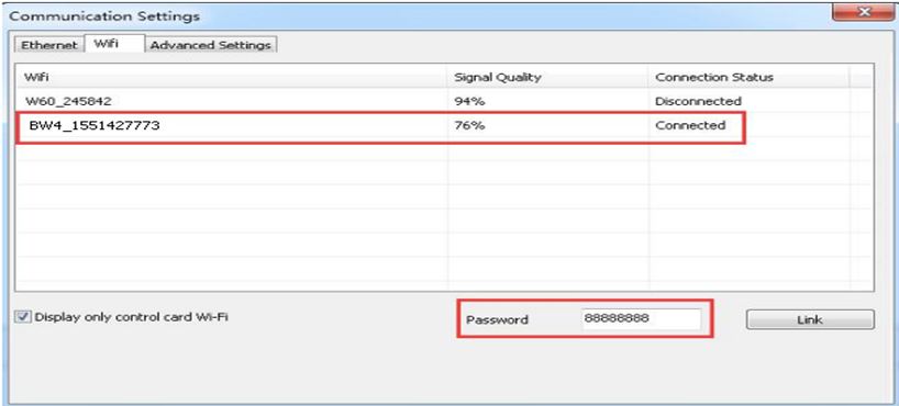 2) Mật khẩu mặc định WIFI, mặc định “ 88888888 “, trong Beco Control 2019 không cần mật khẩu bằng văn bản hiển thị như bên dưới, Nhấp vào LINK và kết nối tự động bằng mật khẩu 8888888, cũng mật khẩu có thể thay đổi.