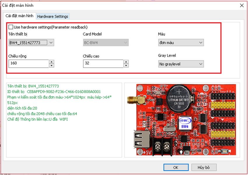 Truy cập: Các thiết lập -> Cài đặt màn hình -> Mật khẩu: 888 -> Hardware Settings -> Chọn cấu hình cho loại module sử dụng -> ok -> truyền chương trình sang mạch qua usb hoặc wifi.