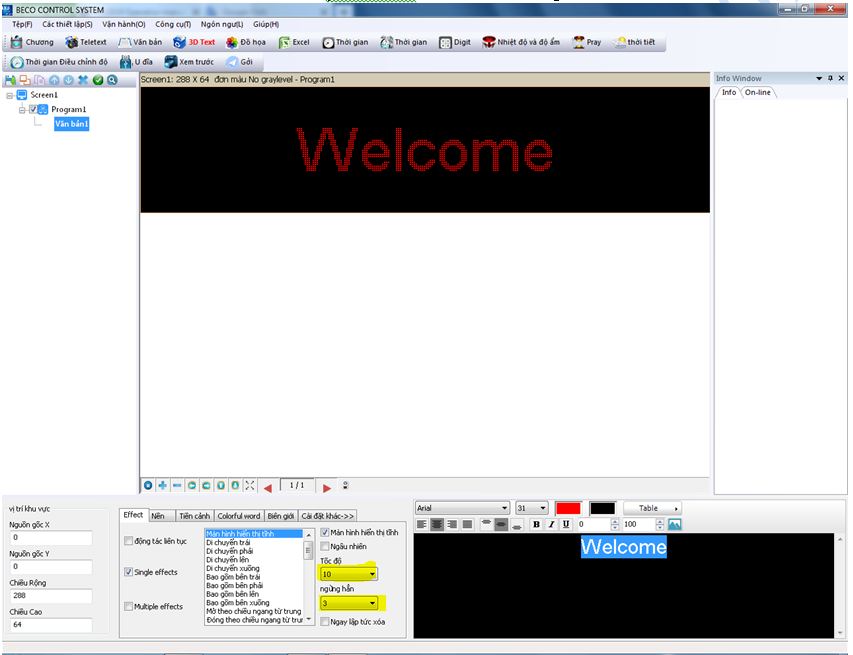 Vấn đề này có thể bạn sẽ gặp phải khi sử dụng tính năng 3D text trên phần mềm BECO CONTROL 2019. Trong từng cài đặt cho hiệu ứng nền, hiệu ứng viền, tiền cảnh,… có phần thiết lập tốc độ, tuy nhiên tốc độ chính của chương trình lại được thiết lập ở mục effect. Các bạn tinh chỉnh 2 thông số này để điều chỉnh tốc độ hiệu ứng cho phù hợp nhé.